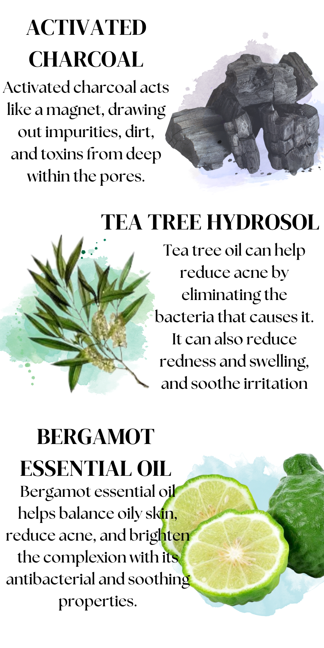 Activated charcoal is a powerful, natural ingredient that helps detoxify, balance, and revitalize the skin, leaving it feeling clean, smooth, and refreshed.