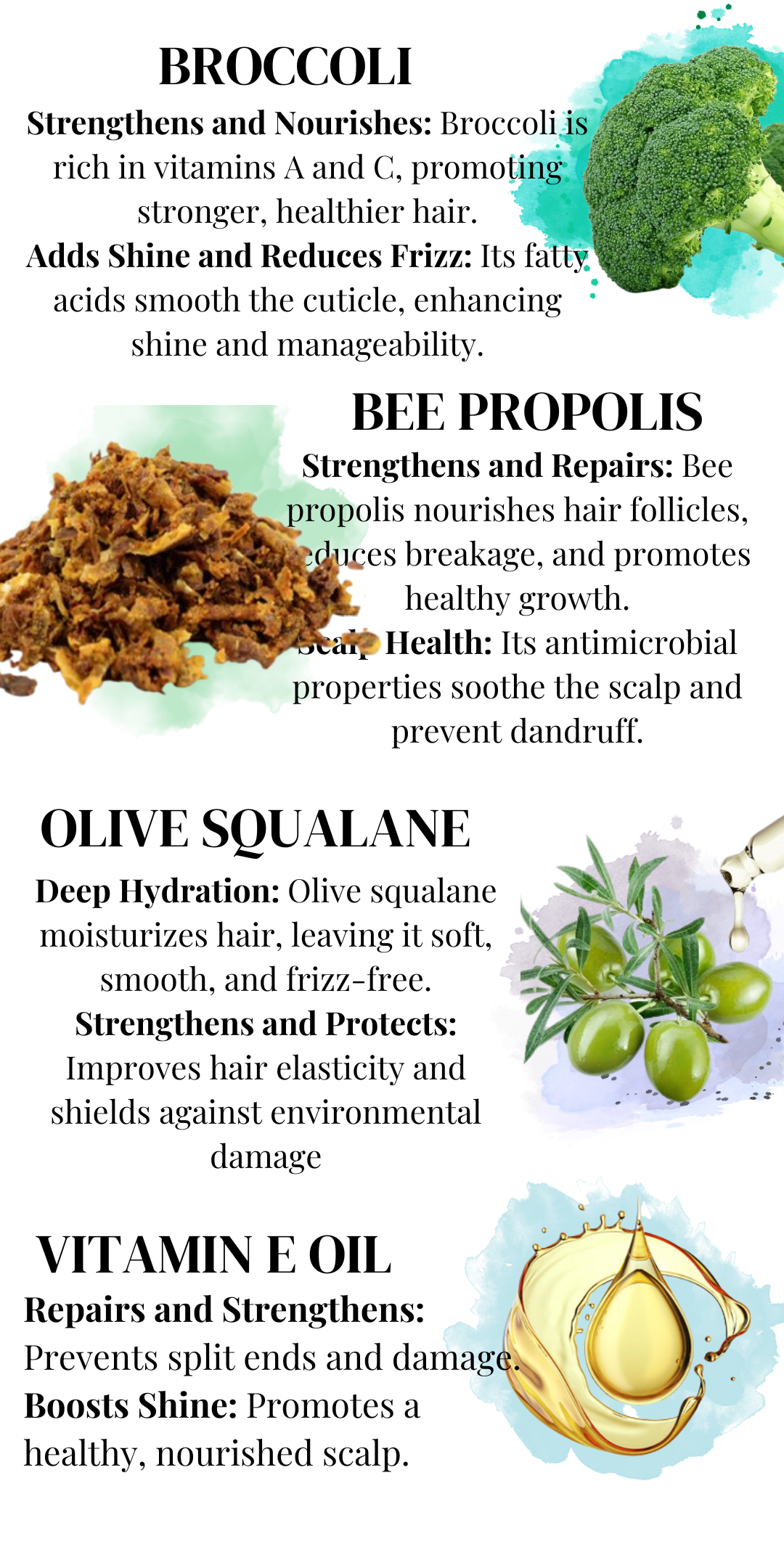Bee Propolis has natural anti-inflammatory and anti-microbial properties that help soothe and protect the scalp, reducing issues like dandruff and irritation.