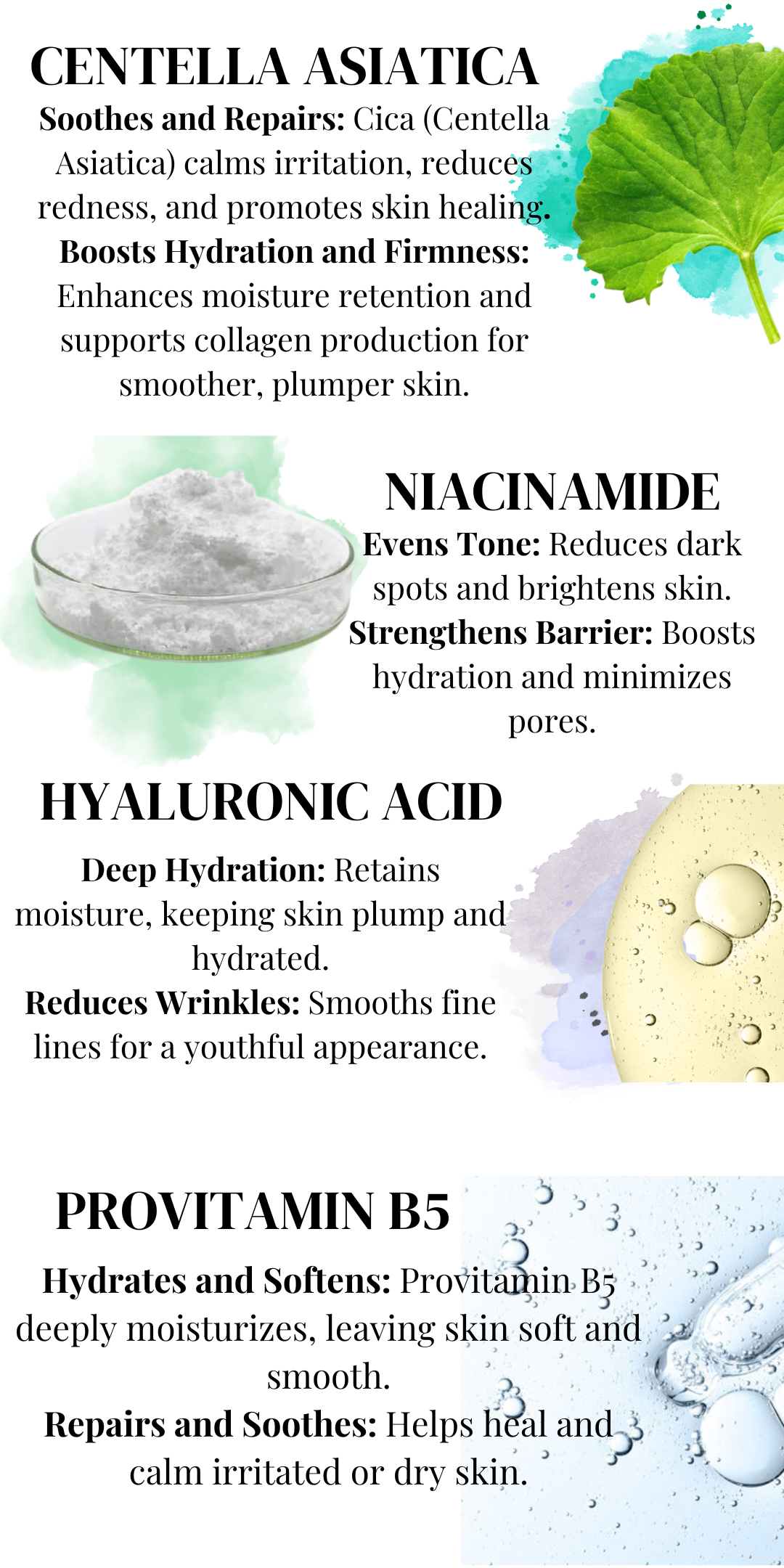 Centella Asiatica (CICA) soothes inflammation by reducing redness and irritation, making it ideal for sensitive or acne-prone skin, while also accelerating healing of wounds and acne scars, strengthening the skin barrier to retain moisture and resist external aggressors, boosting collagen production for anti-aging benefits, and calming sensitive conditions like rosacea or eczema. Niacinamide helps even skin tone by reducing dark spots, hyperpigmentation, and redness, regulates oil production to balance sebum levels, minimizes pores for a smoother look, reduces acne by combating bacteria and soothing breakouts, and improves the skin barrier to lock in hydration and protect against environmental stressors. Hyaluronic Acid delivers intense hydration by attracting and retaining moisture, improves skin texture by softening rough patches, boosts elasticity for a youthful bounce, reduces the appearance of fine lines caused by dehydration, and provides lightweight moisture without clogging pores or leaving a greasy residue.