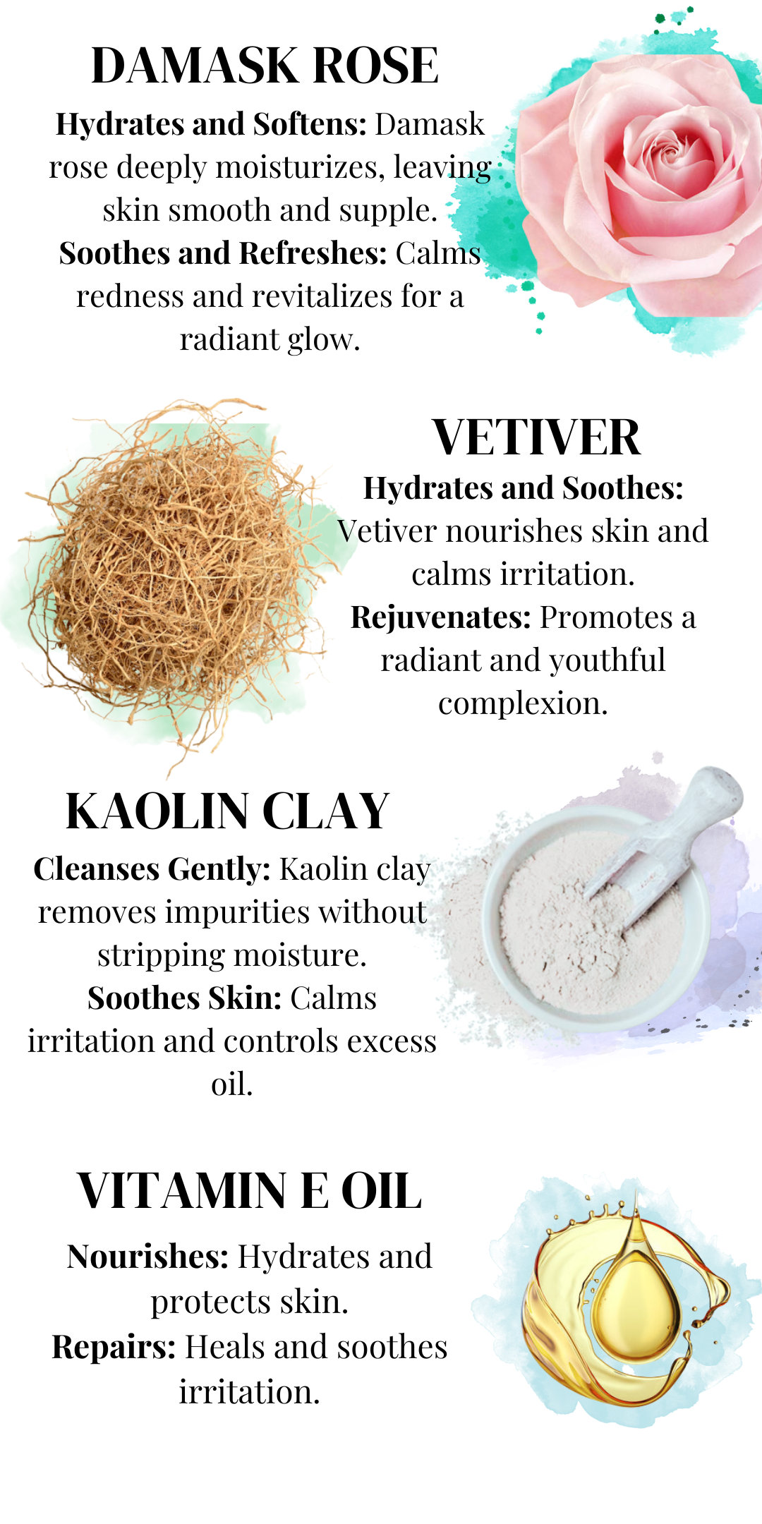 Together, rose and vetiver create a harmonious blend that hydrates, soothes, and rejuvenates the skin while maintaining its natural balance and glow.