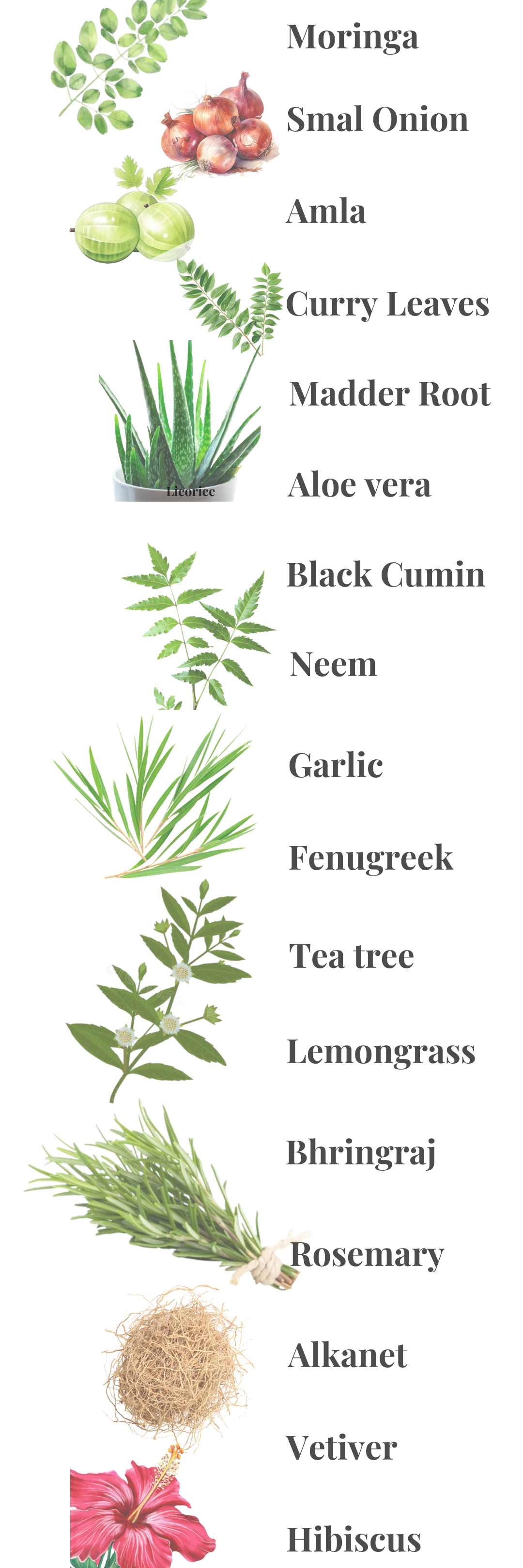 MORINGA: A nutrient powerhouse, moringa is rich in iron, which improves oxygen supply to hair follicles, and amino acids like arginine and cysteine that promote hair growth. Its abundance of Vitamins C and E helps combat free radicals and enhances scalp health.