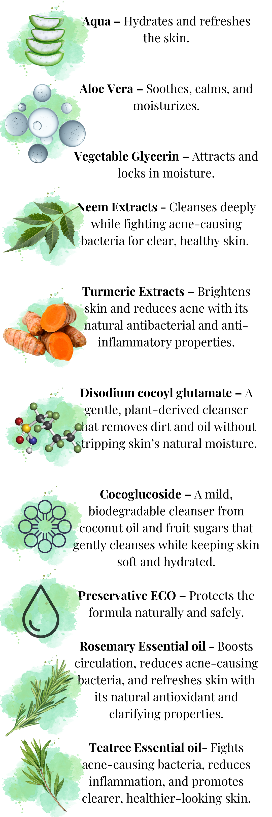 ANTI-INFLAMMATORY: Both neem and turmeric have anti-inflammatory properties that help calm irritated or inflamed skin, making this face wash ideal for sensitive or acne-prone skin.