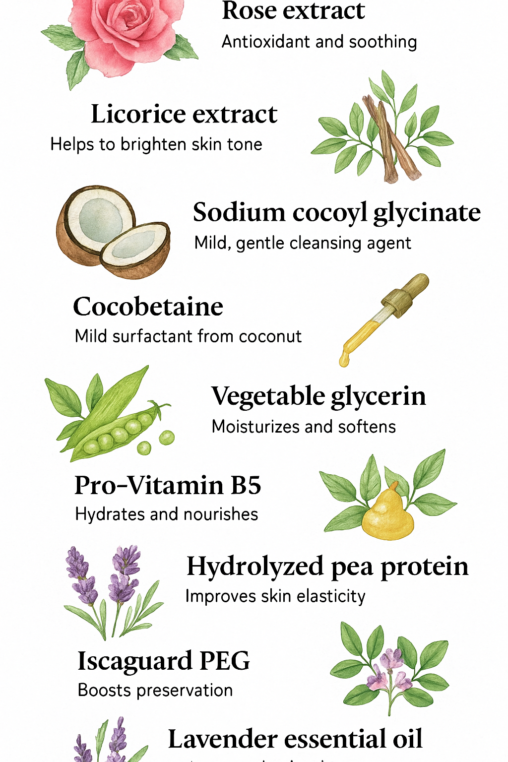 Formulated with Sodium Cocoyl Glycinate and Cocobetaine, gentle coconut-derived surfactants, it offers a rich lather without stripping your skin of its natural oils. Licorice extract brightens and evens out skin tone, while Pro-Vitamin B5, Hydrolysed Pea Protein, and Vegetable Glycerin deeply moisturize, soften, and restore elasticity. Enhanced with Lavender and Rose essential oils, this botanical blend soothes your mind and body, turning your shower into a spa-like experience.